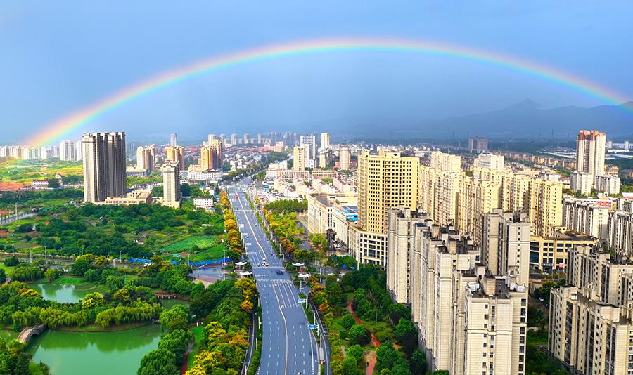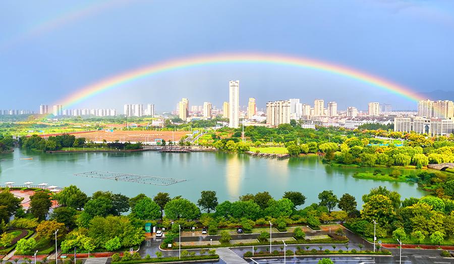 近日,雨后初霁,在安徽省铜陵市临津湖上空出现短暂的彩虹景观,似一座拱桥架在半空,与一湖碧波相互映衬,宛如画卷。