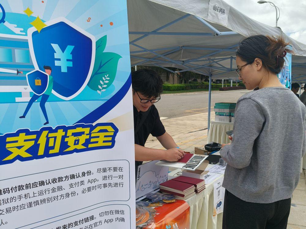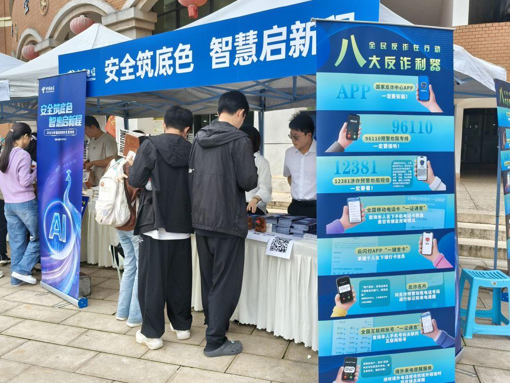 校园的露天广场上还安排有网络安全知识趣味问答活动,吸引学生参与,让他们在轻松愉快的氛围中巩固了反诈知识。还有工作人员向路过的学生发放反诈宣传手册。