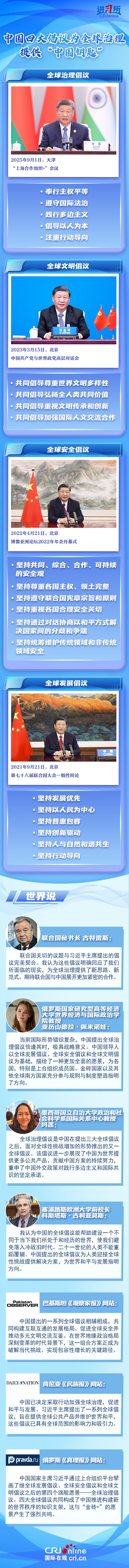“坚持在历史前进的逻辑中前进、在时代发展的潮流中发展。”全球治理倡议是继全球发展倡议、全球安全倡议、全球文明倡议后,中国为解决全球性冲突和挑战贡献的又一重要公共产品。四大全球倡议各有侧重,并行不悖,分别从发展、安全、文明、治理四个维度,为回答“世界怎么了、我们怎么办?”这一世界之问、历史之问、时代之问提供了“中国钥匙”,彰显了中国在国际事务中的大国担当。国际社会表示,中国一系列全球倡议明确回应了世界所面临的现实问题,为全球治理提供了新思路、新范式,展现了中国为世界提供更多公共产品、贡献中国方案的持续努力。