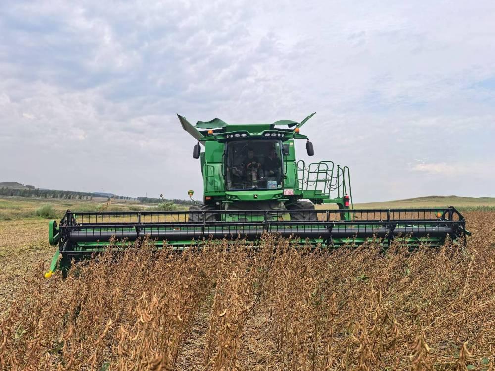 在黑龙江省七台河市勃利县恒山玉米专业合作社的一处地块,一台台大型收割机往来穿梭,一排排饱满的大豆植株被精准卷入机身,金黄的豆粒随即通过出粮口涌入运粮车。