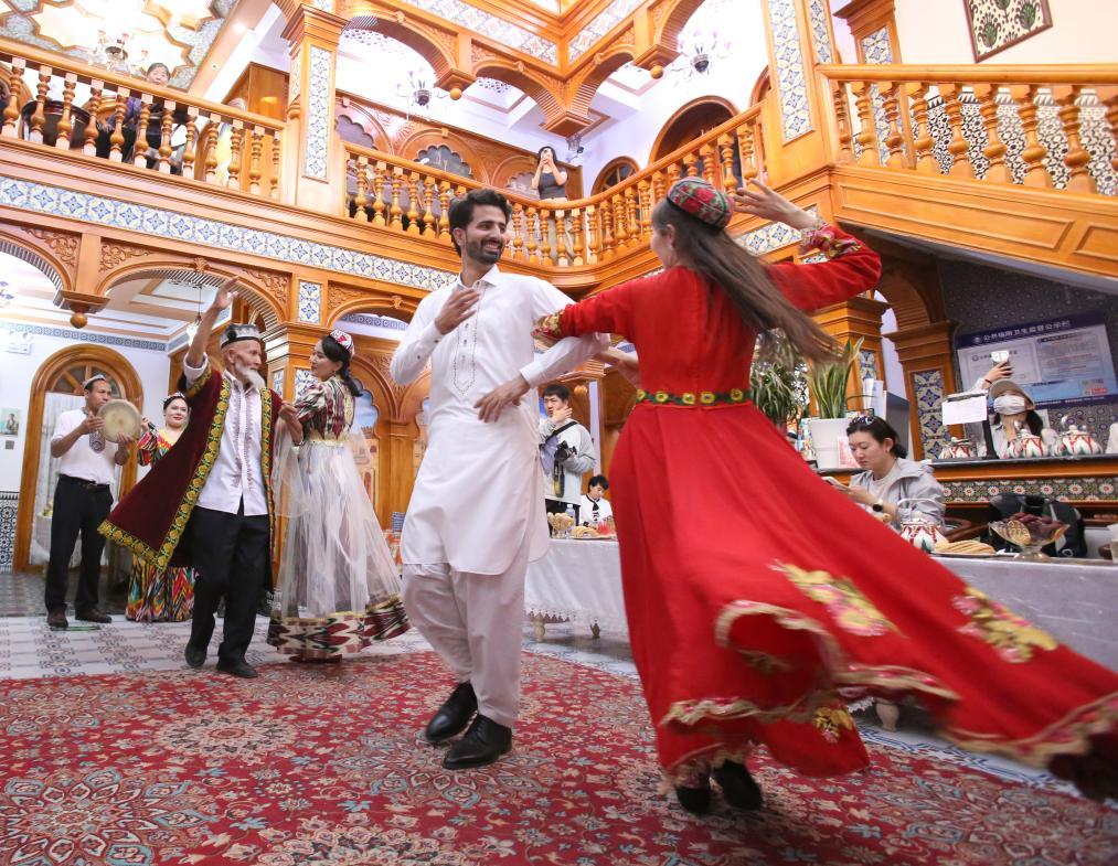 2025年9月10日,来自巴基斯坦的游客韩帅(前右二)在新疆喀什古城景区“古丽的家”民宿与工作人员跳舞。喀什古城景区历史底蕴深厚,2025年1至7月,接待游客达1668.6万人次,实现旅游综合收入74.7亿元。新华社记者 程丽 摄