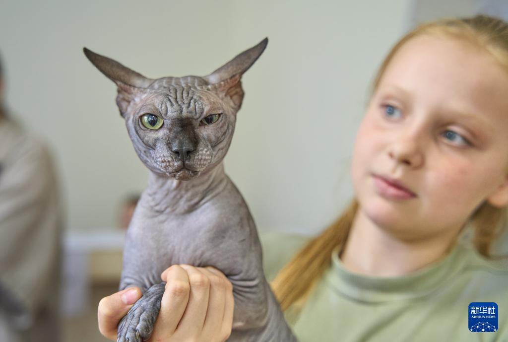 9月21日,一名女孩展示她的斯芬克斯猫。