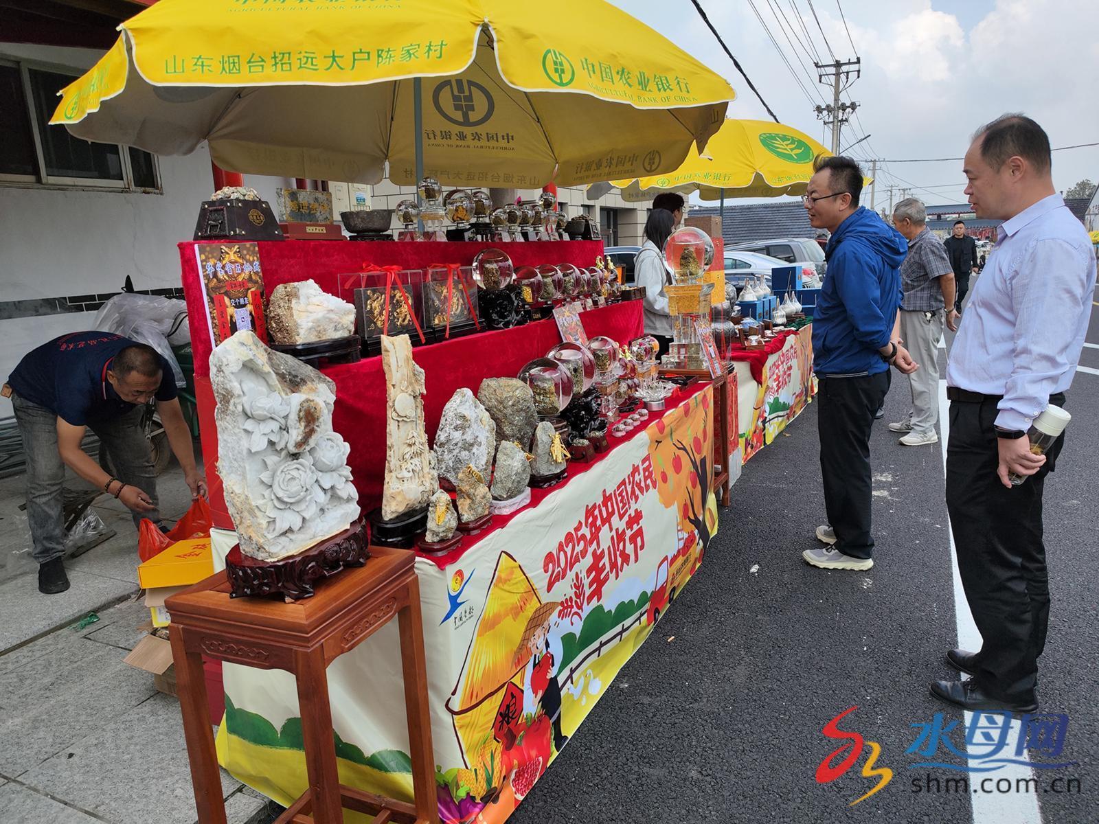 在大户陈家村主干道远东大街,由西向东的道路两侧是乡村大集活动展区,沿线设置全国农业品牌精品展、黄河大集、运河大集、海洋大集。该部分主要展示花生、大豆、小麦等各地特色农产品。本周末为预展期,参展的招远多个当地镇街,均精心设计了自家展台,以实实在在的特色农产品迎接丰收节的到来。