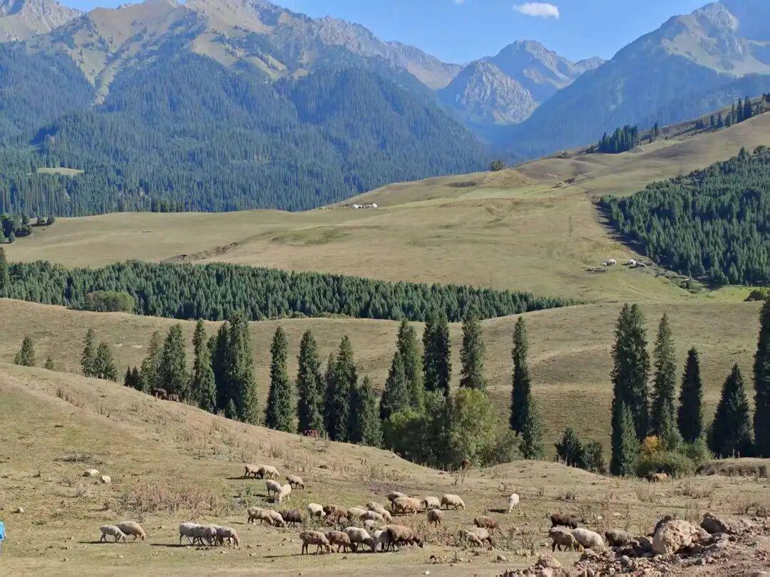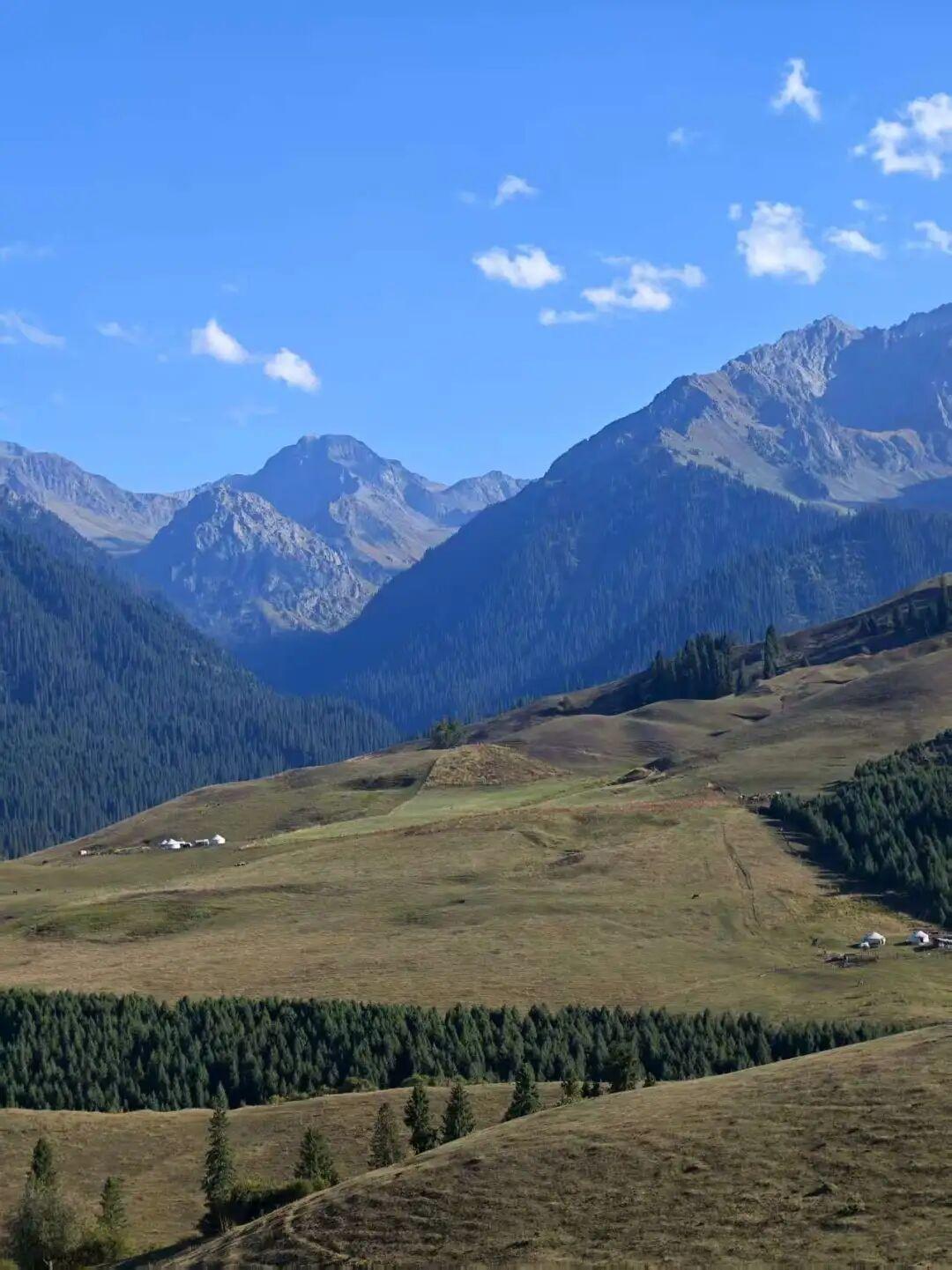 无际的湛蓝天空,形态飘逸的大小云朵,缓缓地漂游着,轻柔地抚摸着山之巅顶;雄浑苍茫的那拉提山和塔什帕拉提山,连绵辽阔,肉眼所及的最高峰,经过了一个夏季的日晒,仍依稀可见斑点雪线。