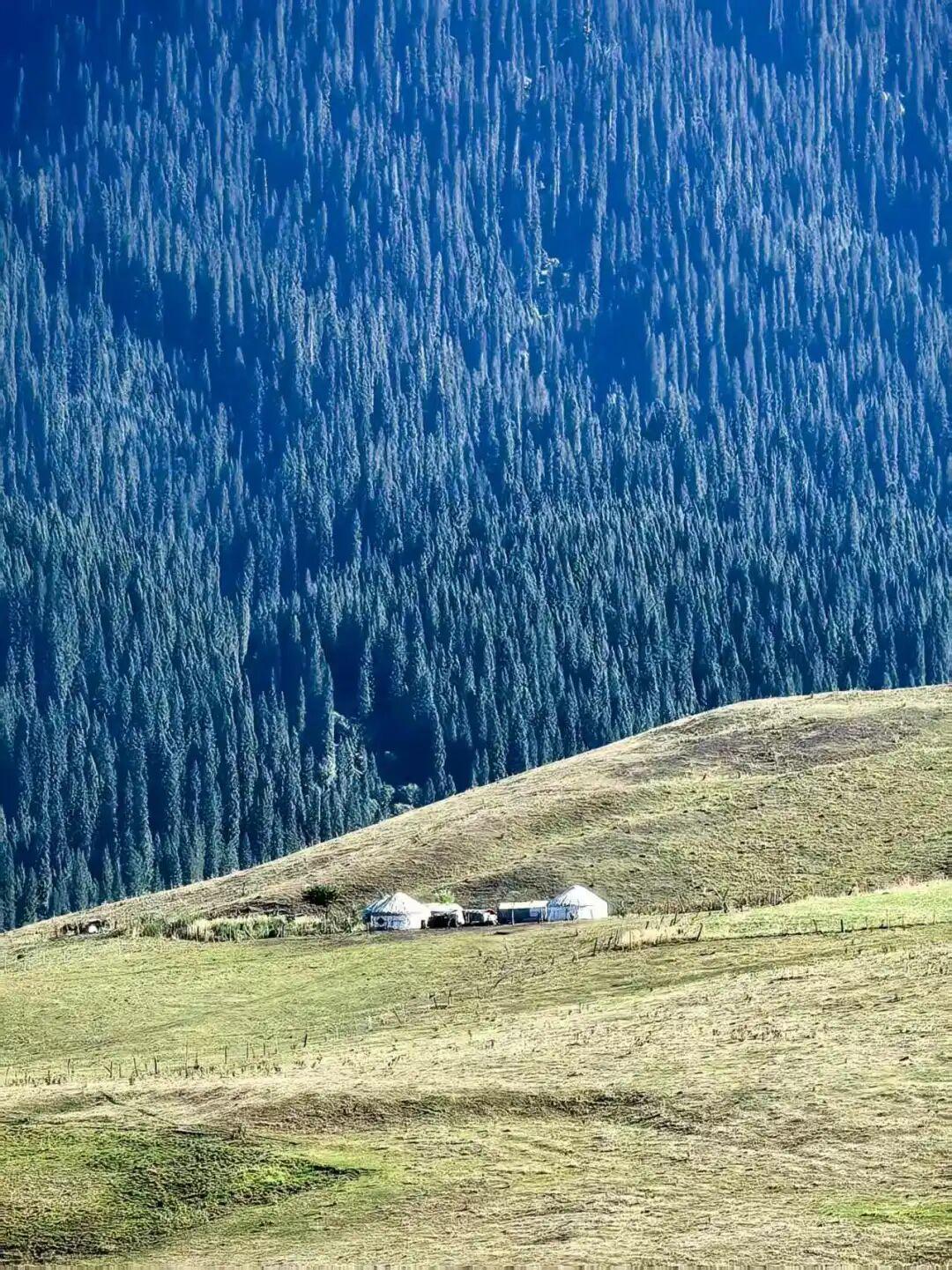 车在山道中穿行,清澈的雪山融水,溜着渠边的鹅卵石,蜿蜒流淌,笔直的杉木森林渐次密布。下午六点,地理坐标显示,我们已进入天山山脉褶皱地带的恰西,这片未被开发的处女地,千百年来始终保留着一如既往的原始风貌。