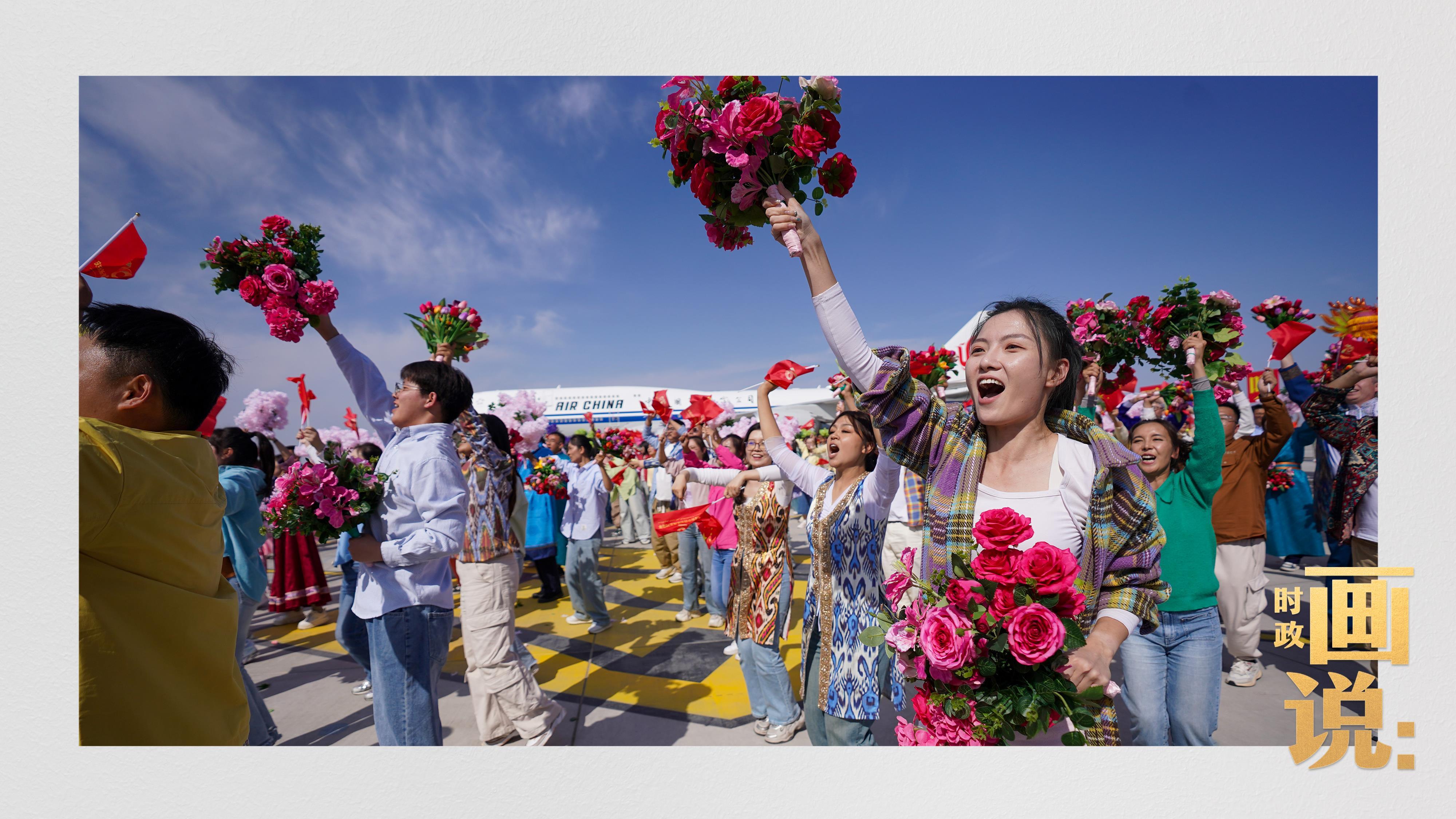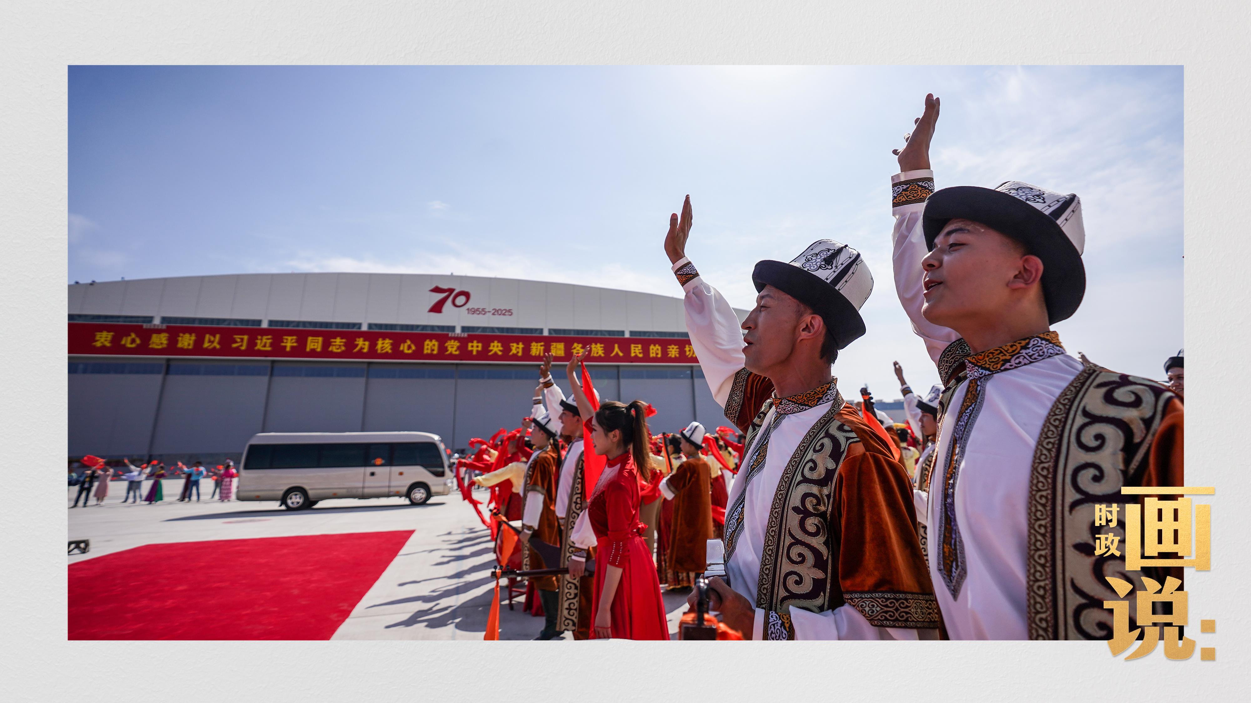 中共中央总书记、国家主席、中央军委主席习近平率中央代表团23日下午乘专机抵达乌鲁木齐,出席新疆维吾尔自治区成立70周年庆祝活动。习近平在机场受到新疆各族群众的热烈欢迎。