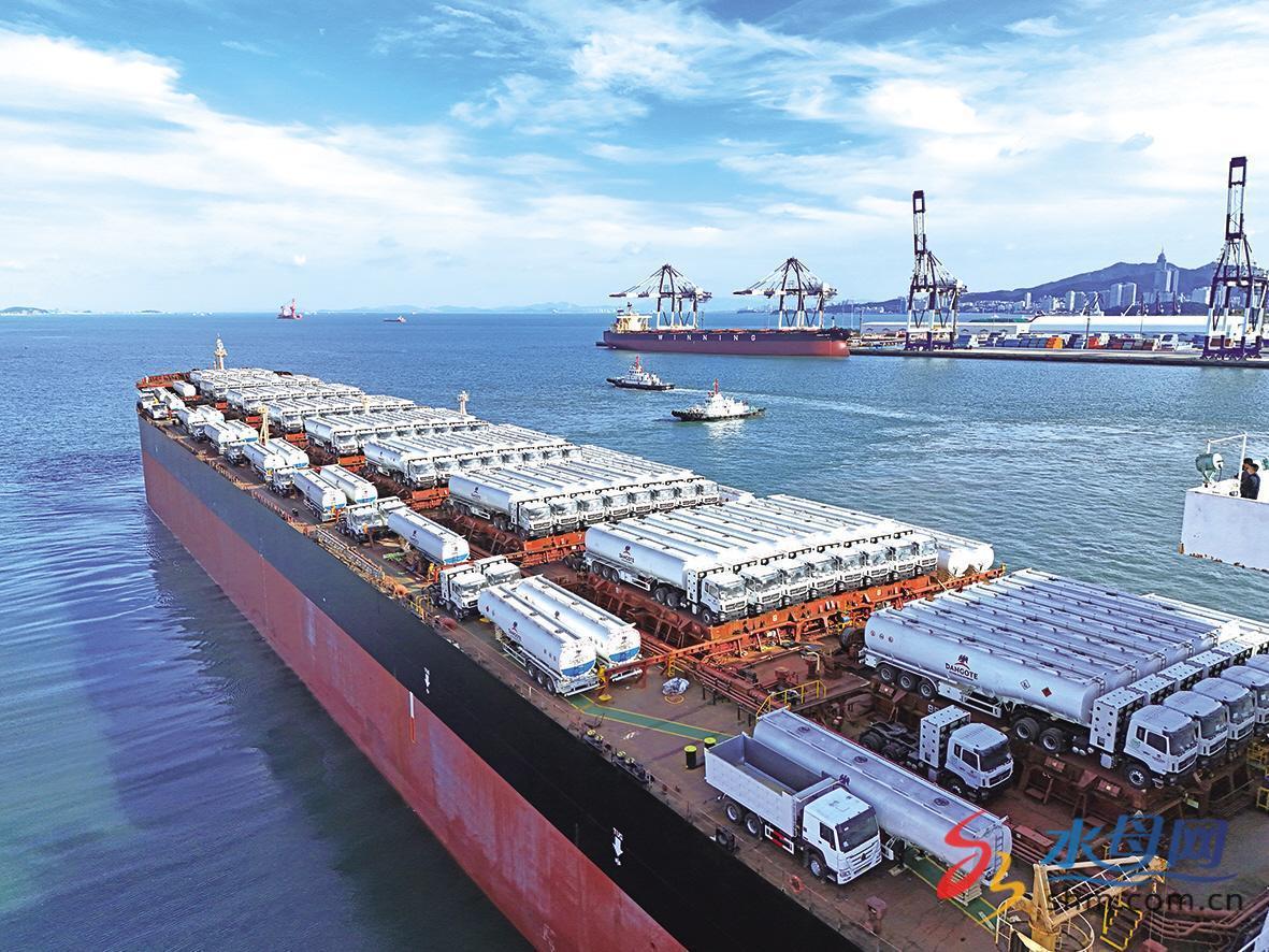 装载着重型卡车的中非班轮从山东港口烟台港起航驶往尼日利亚。YMG全媒体记者 唐克 摄