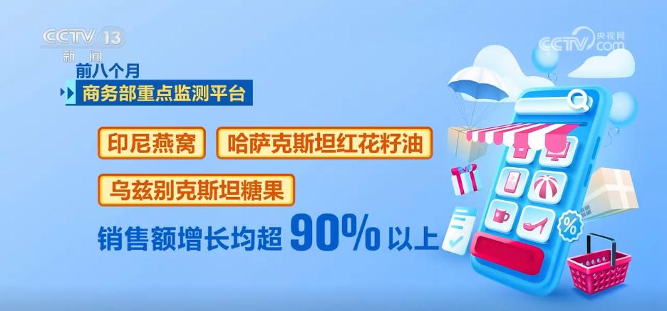 此外,国际合作互利共赢惠及全球。今年以来,举办“丝路电商惠全球”主题活动超20场。前8个月,商务部重点监测平台印尼燕窝、哈萨克斯坦红花籽油、乌兹别克斯坦糖果销售额分别增长超90%以上。