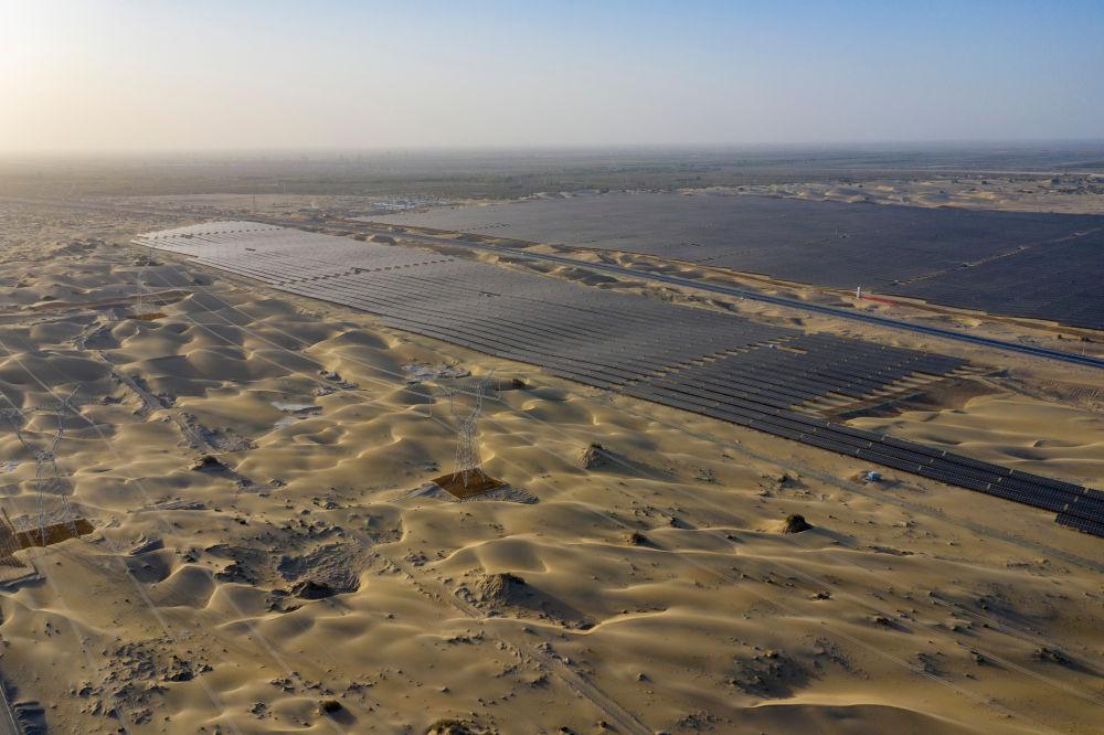 9月22日在新疆巴音郭楞蒙古自治州若羌县拍摄的中国绿发新疆中绿电若羌400万千瓦光伏项目(无人机照片)。该项目每年可发电69.08亿千瓦时,满足南疆200万户家庭用电需求,减排208.24万吨煤耗。新疆总面积