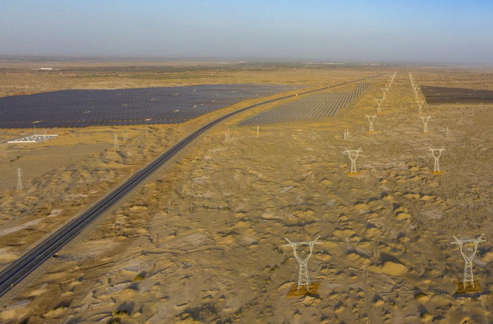 9月22日在新疆巴音郭楞蒙古自治州境内的乌若高速附近拍摄的光伏电站和输电线(无人机照片)。如今