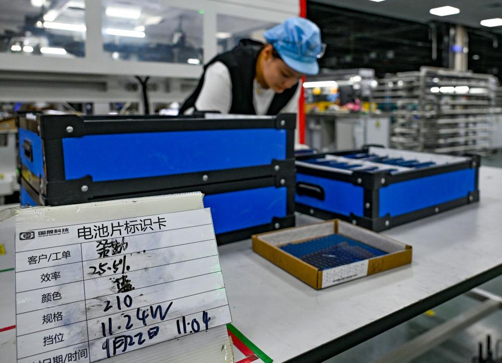 9月22日,工人在新疆巴音郭楞蒙古自治州若羌县的国晟企诚新能源有限公司内挑选即将发往新疆策勒某光伏电站的光伏电池片。