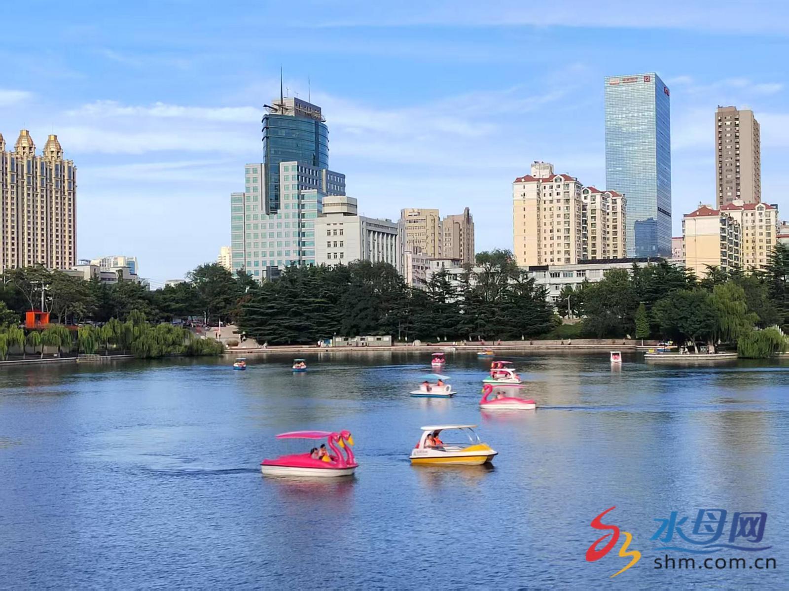 蓝天白云作幕,彩船摇曳在南山公园人工湖上,勾勒出别样诗意。王书成 摄