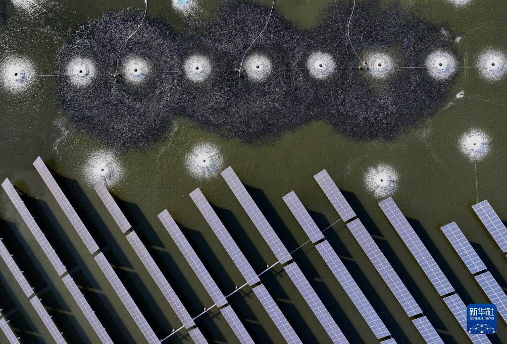 9月29日,鱼群在河北省唐山市丰南区黑沿子镇“渔光一体”现代渔业产业园鱼塘内觅食(无人机照片)。