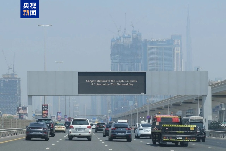△迪拜市中心公路大屏上播放着“祝贺中华人民共和国成立76周年”的贺词