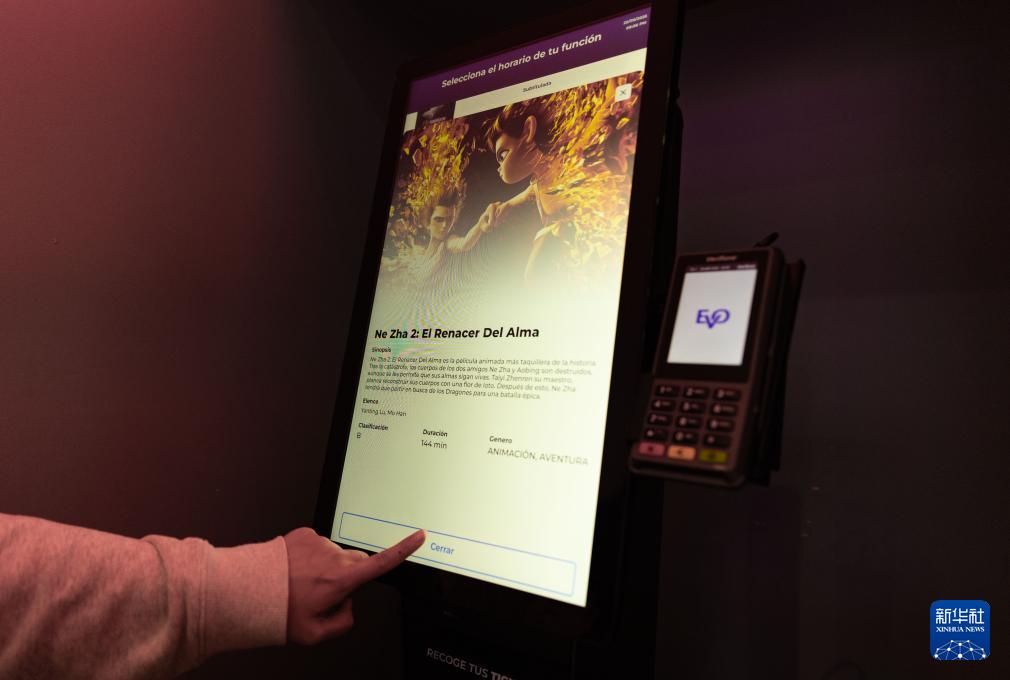 9月25日,在墨西哥首都墨西哥城的一家电影院,观众在自动售票机上购买《哪吒2》电影票。新华社记者 李梦馨 摄