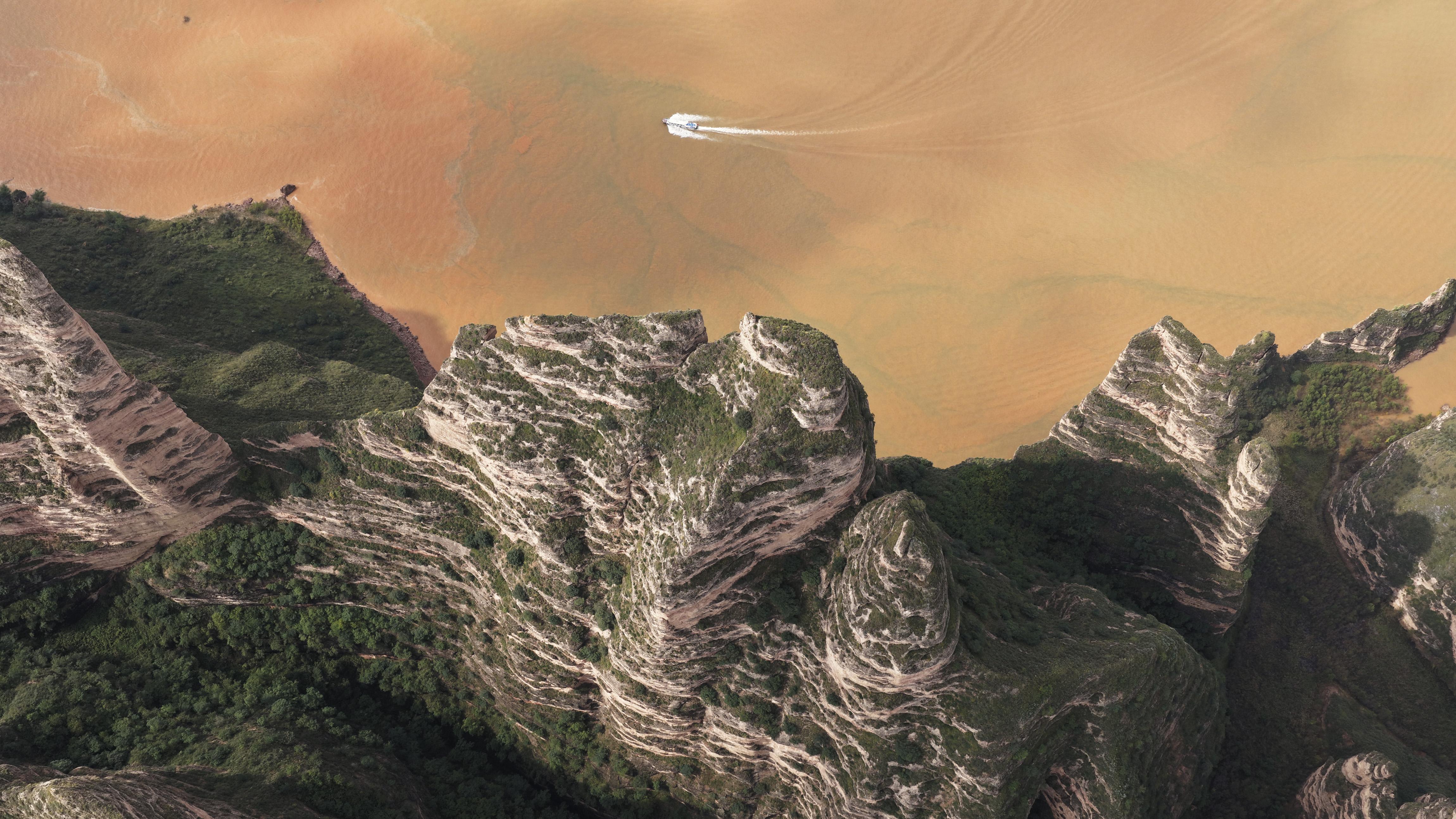10月6日,游客乘船在甘肃炳灵丹霞国家地质公园游览(无人机照片)。