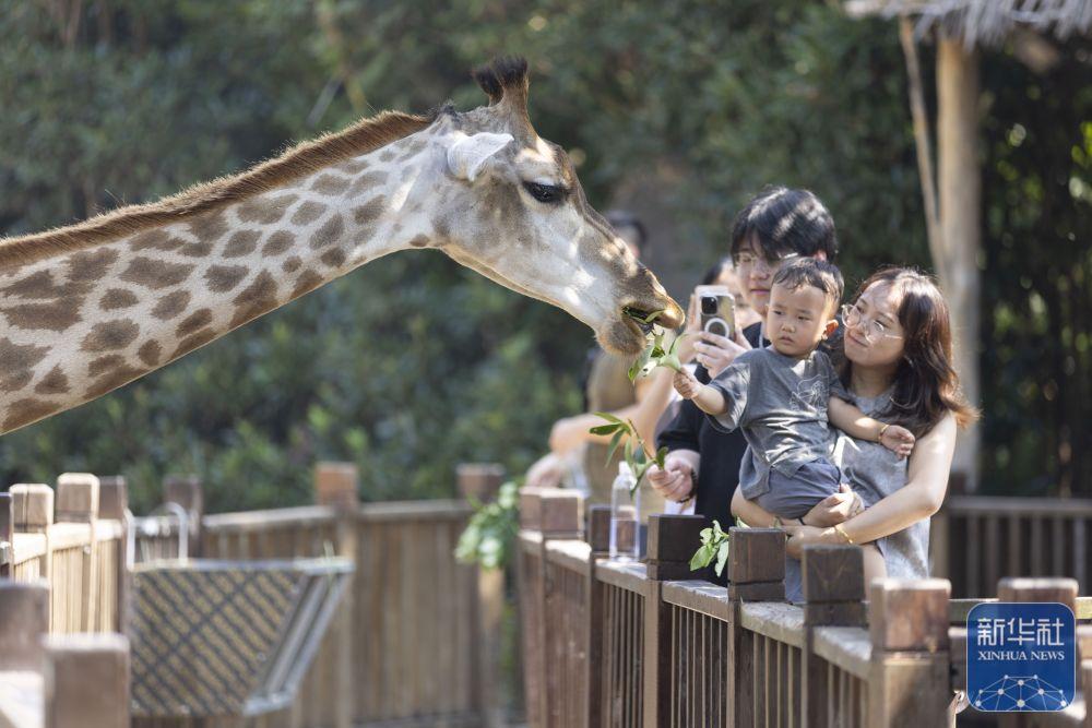 ↑ 10月6日,小朋友在上海野生动物园与长颈鹿互动。新华社记者 王翔 摄