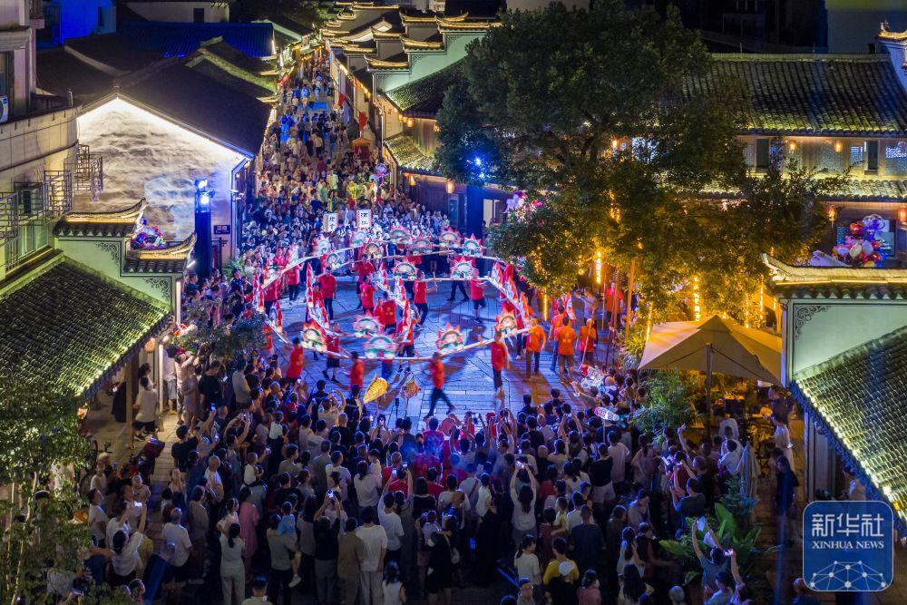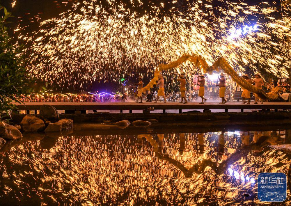 ↑ 10月5日晚,在四川省成都市双流区黄龙溪古镇,民间艺人为游客表演非遗“火龙灯舞”。新华社发(李向雨摄)