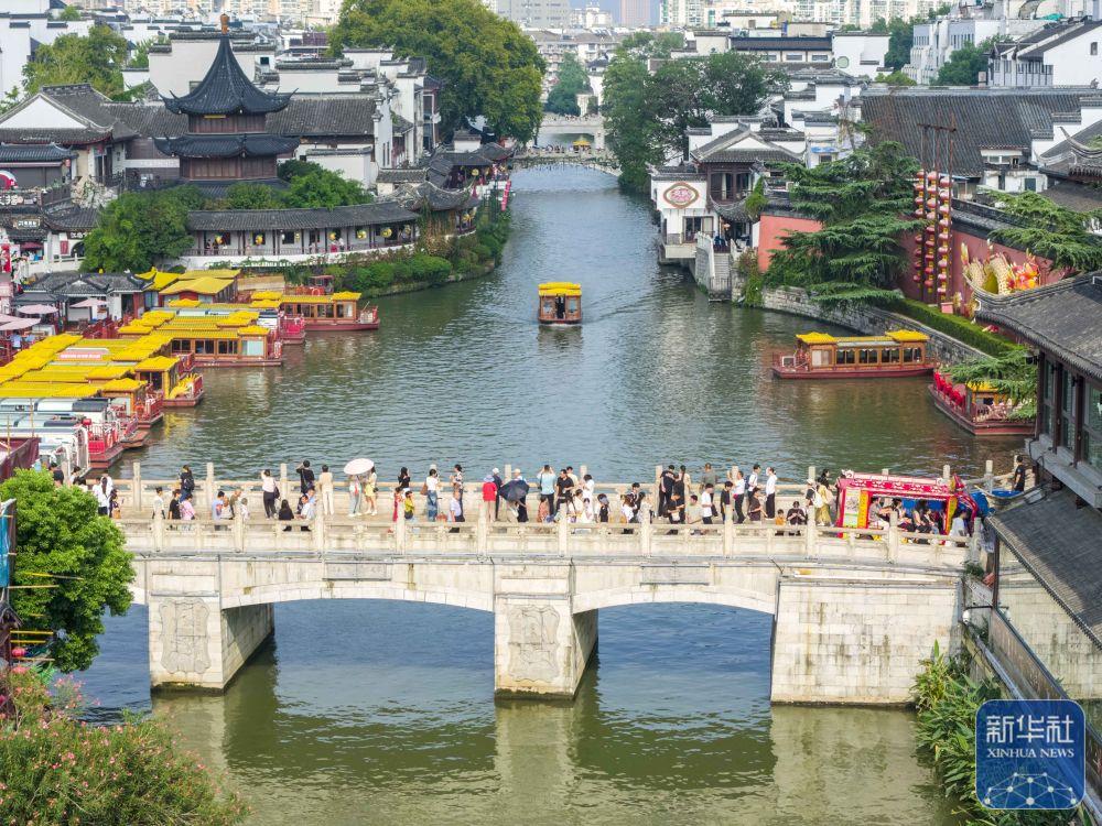 ↑ 10月5日,人们在南京夫子庙景区游玩(无人机照片)。新华社发(史俊摄)