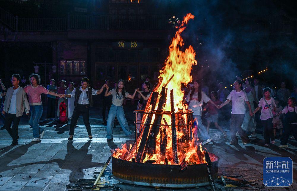 ↑ 10月5日晚,在贵州省晴隆县阿妹戚托小镇,游客与当地群众围着篝火共舞。新华社记者 杨文斌 摄