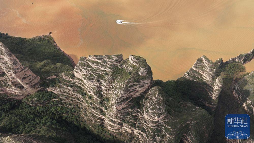 ↑ 10月6日,游客乘船在甘肃炳灵丹霞国家地质公园游览(无人机照片)。新华社发(史有东摄)