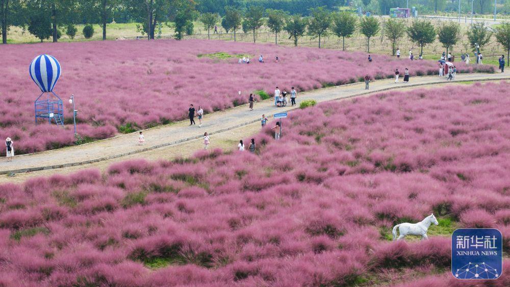 ↑ 10月5日,人们在南京八卦洲陌上花渡游玩(无人机照片)。新华社发(苏阳摄)