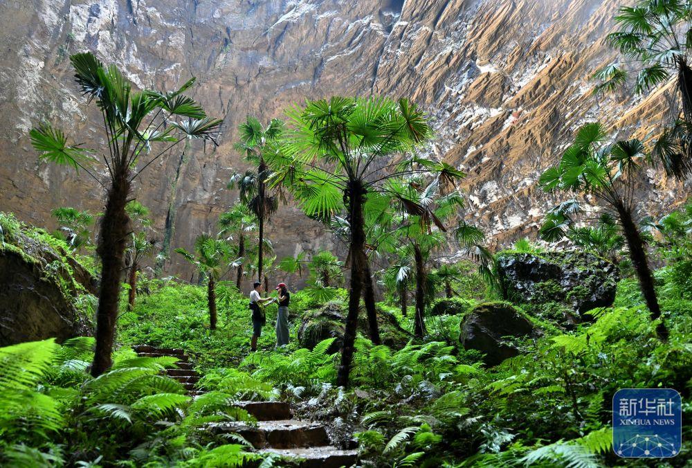 ↑ 10月6日,游客在湖北省宣恩县矅天眼景区深达290余米的锣圈岩天坑底部观光游玩。新华社发(宋文摄)