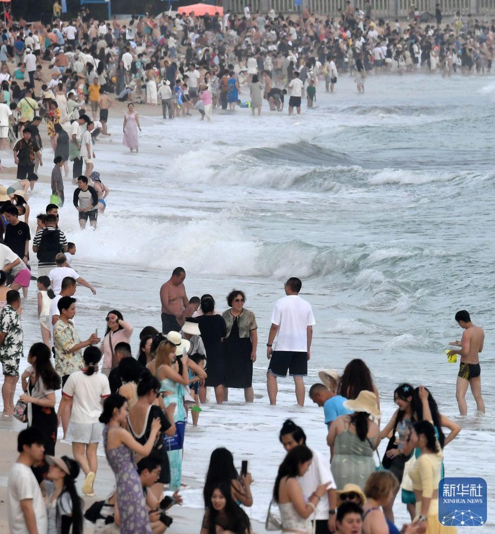 ↑ 10月6日,在海南省三亚市大东海景区,市民和游客在海滩戏水。新华社记者 赵颖全 摄