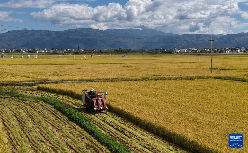 10月10日,工人在云南省大理市喜洲镇水稻种植基地收割水稻(无人机照片)。