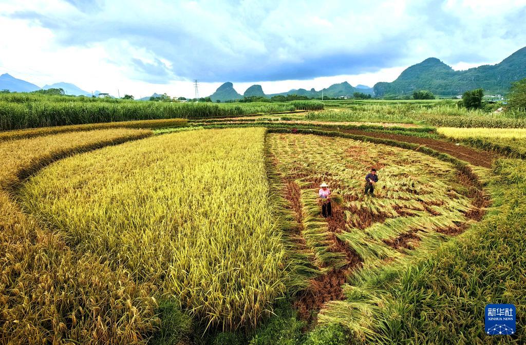 10月15日,广西来宾市忻城县城关镇泮水村农民在稻田里抢收稻谷。