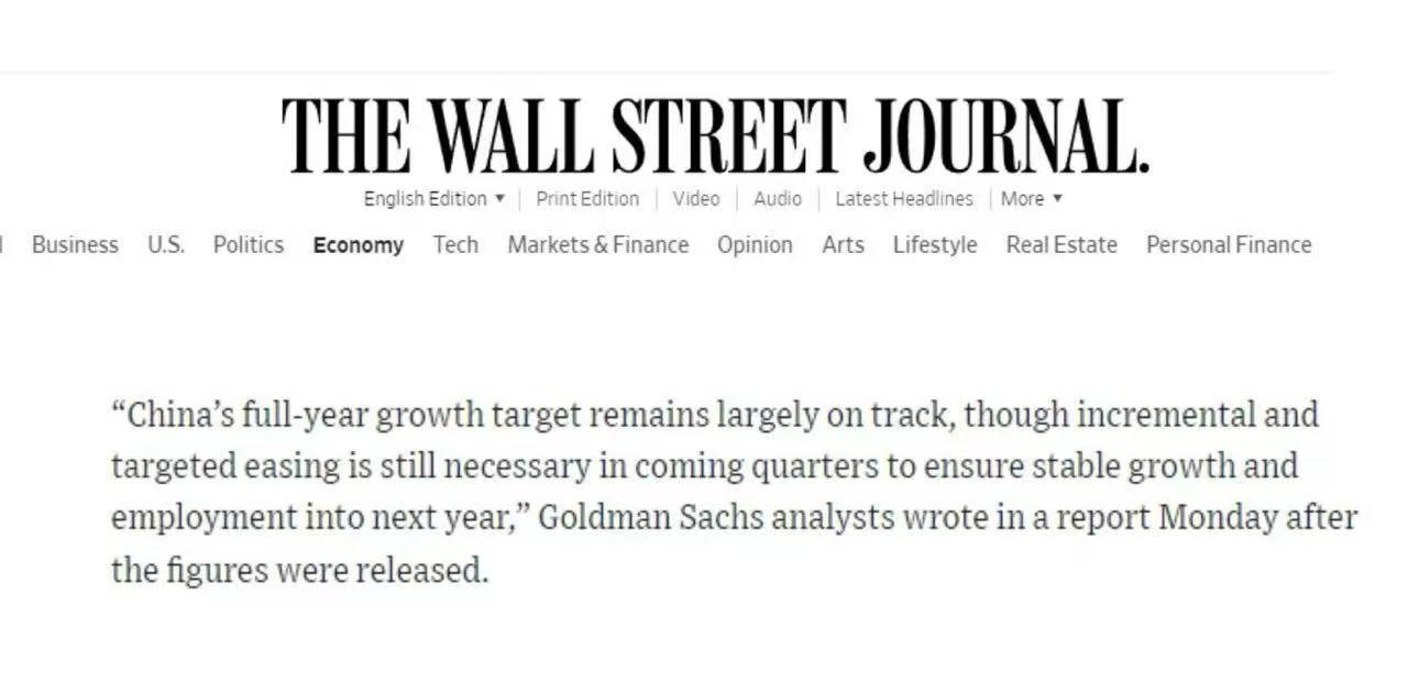 美国《华尔街日报》报道显示,2023年前三季度中国GDP同比增长5.2%,意味着"5%左右"的年度增长目标已基本达成。报道援引高盛分析师观点称,虽然未来几个季度仍需实施渐进式、结构性的宽松政策,但全年经济增速仍将总体符合预期。