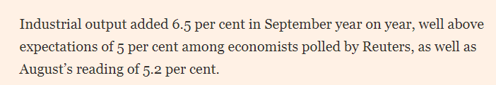 英国《金融时报》的文章分析说,9月规模以上工业增加值同比增长6.5%,显著高于路透社调查经济学家预期的5%及8月的5.2%。荷兰国际集团(ING)经济学家分析称,超预期表现主要源于外需拉动。文章说,上周,海关数据显示,中国出口保持韧性,9月同比增长8.3%,对东南亚等地区出口持续增长。