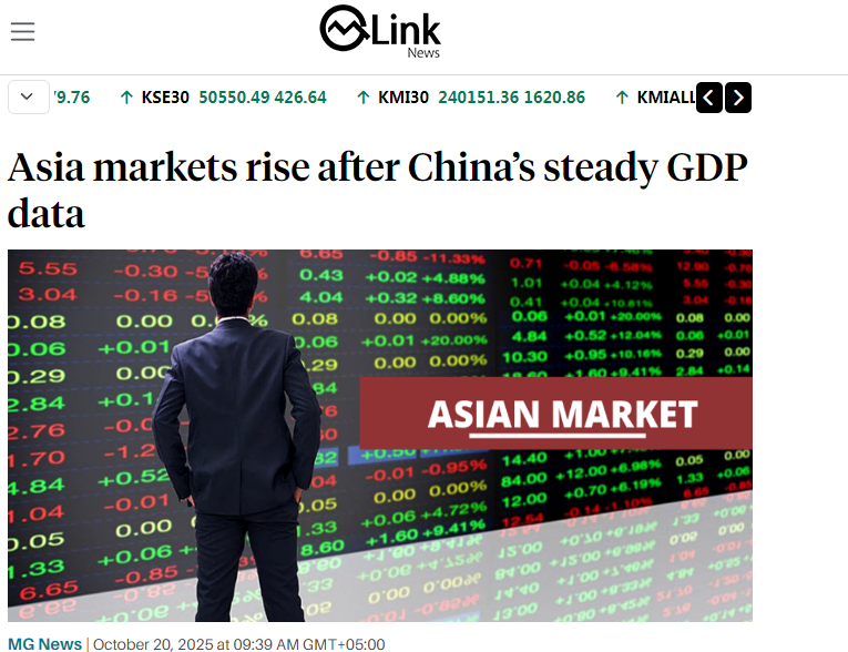 巴基斯坦金融网站Mettis Global Link发表题为《亚洲股市响应中国稳健GDP数据普涨》的文章。文章分析称,亚洲市场20日迎来开门红,得益于中国的最新经济数据。中国第三季度GDP同比增长4.8%,同时维持贷款市场报价利率(LPR)。股市方面,香港恒生指数大涨逾2%,内地沪深300指数上涨0.74%。日经225指数飙升近3%,首次突破49000点大关,东证指数上涨2%。