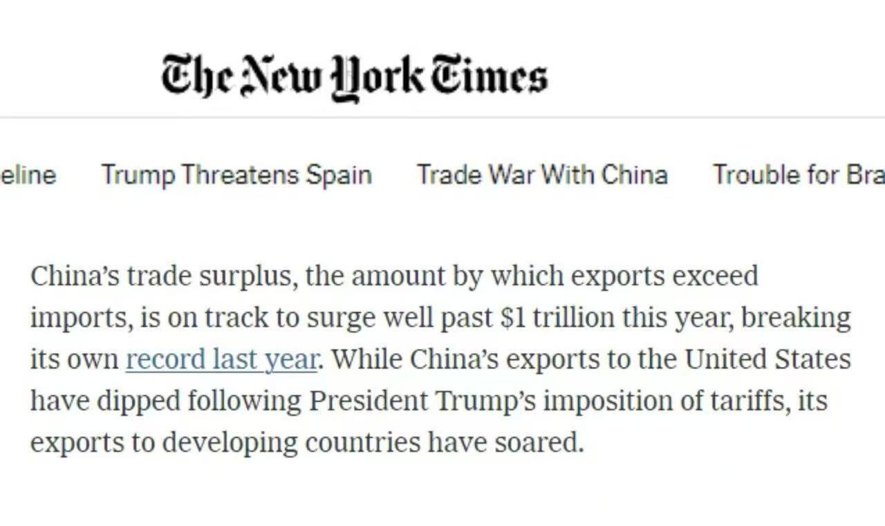 美国《纽约时报》的文章分析称,强劲的出口和对新工厂的持续投资使中国经济在夏季保持稳定增长。中国的出口投资以及用国产商品取代进口的政策继续推动着经济增长。与去年同期相比,商品贸易顺差在过去三个月中增加了12.4%。中国的贸易顺差今年有望超过1万亿美元,主要得益于中国对发展中国家的出口激增。