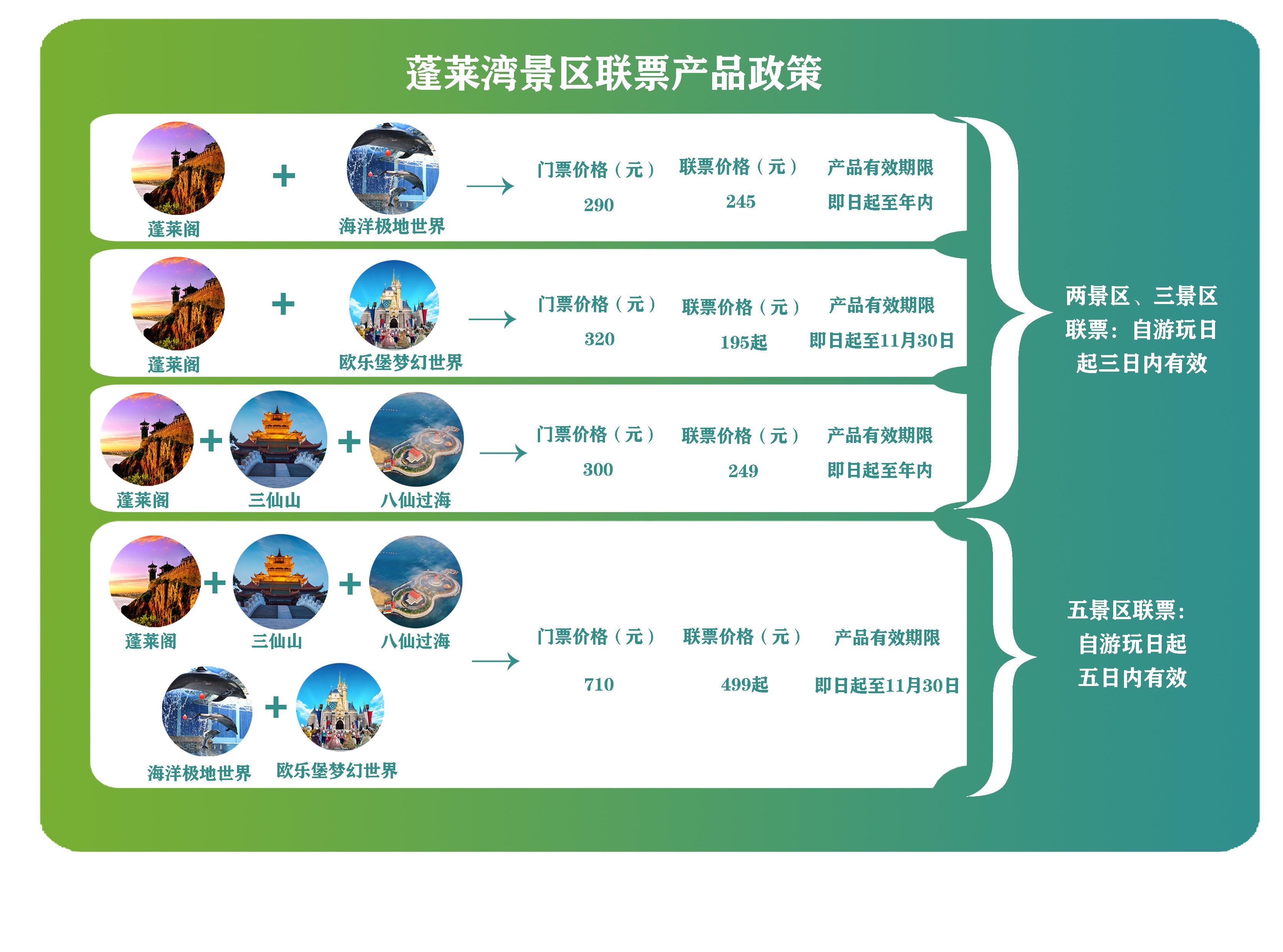 蓬莱湾联票淡季大让利,5大类44项增值服务加持。蓬莱区依托5公里海岸线与4.2平方公里滨海旅游带,整合蓬莱阁、八仙过海、三仙山、欧乐堡海洋极地世界、欧乐堡梦幻世界等核心景区推出“蓬莱湾景区联票”,2025年已售出超3.3万张。即日起至12月底,联票开启淡季优惠:蓬莱阁+欧乐堡梦幻世界两景区联票在原门市价320元基础上,现推出最低195元价格优惠;蓬莱阁+欧乐堡海洋极地世界两景区联票在原门市价290元基础上,现推出245元价格优惠;蓬莱阁+三仙山+八仙过海三景区联票在原门市价300元基础上,现推出249元价格优惠;蓬莱阁+三仙山+八仙过海+海洋极地世界+欧乐堡梦幻世界五景区在原票价710元基础上,推出最低499元价格优惠。同步延长联票产品游玩期限,两景点、三景点联票有效期3天,五景点联票有效期5天,进一步提升游客在蓬行程灵活性(12月仅欧乐堡梦幻世界因设备维修停业,其余联票优惠不变)。