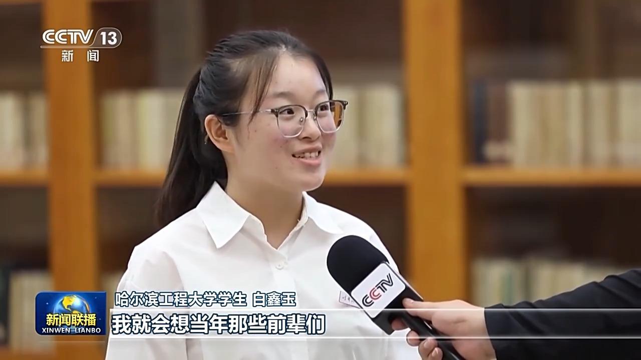 哈尔滨工程大学学生 白鑫玉:我们上课铃下课铃是军号,有时候坐在教学楼里的时候,我就会想当年那些前辈们是不是也像我一样这么学习。这个时候我就想,我要是再努力一点,就能再靠近他们一点。
