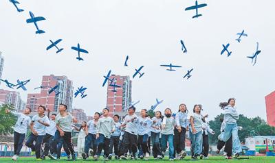 江苏省宿迁市泗洪县新星城西学校,学生们在放飞飞机模型。李 佳摄(影像中国)