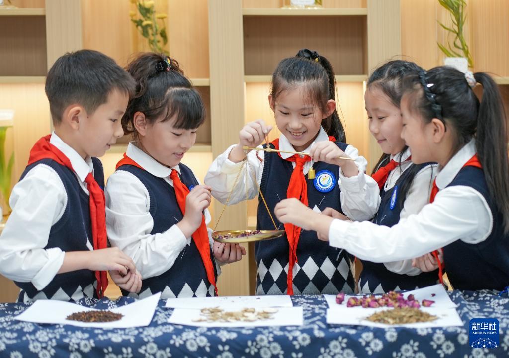 10月22日,在江苏省泰州市姜堰区实验小学教育集团北街北校区,学生体验称量中草药。