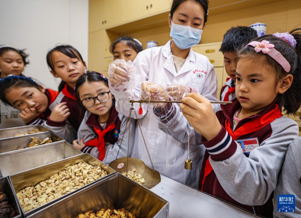 10月22日,在山东省荣成市中医院中医药科普馆,学生学习称量中药材。