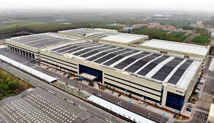 2025年4月17日拍摄的位于山东青岛胶州市的海尔AI赋能多联机互联工厂(无人机照片)。新华社记者 李紫恒 摄
