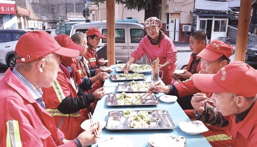 在操作台前,公司员工与志愿者们分工协作、默契配合,揉面、擀皮、包馅等工序一气呵成。午餐时分,热气腾腾的鲅鱼饺子陆续端上桌,浓郁的鲜香瞬间弥漫整个房间。受邀而来的奇山道路保洁员、奇山办事处特殊人员围坐一桌,细细品尝着这份饱含心意的美食,脸上洋溢着幸福满足的笑容。