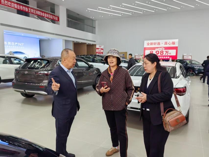 作为烟台市及芝罘区重点工程,坐落于烟台机场路的烟台市汽车科技文化城,是烟台首个以“新能源汽车+”为核心的汽车主题产业区。项目以科技赋能、服务聚合、产业融合为特色,构建集消费体验、产业升级、城市地标于一体的汽车产业新生态,提供购车、挂牌、维保、充电等一站式全功能服务,全力推动芝罘区汽车产业集群提档升级。据了解,该项目预计年产值超50亿元,年创税收1200万元,可直接及间接带动1300人就业,为区域经济发展注入强劲动力。采风团一行重点走访了芝罘区昊铂汽车销售公司。公司法定代表人、董事长孙洪国详细介绍了产业园规划布局、发展前景及广汽在园区的发展理念,带领大家近距离参观了价值130余万元、1.9秒破百的中国第一轿跑昊铂SSR——该车曾获多位重要领导试驾体验,采风成员纷纷与轿跑合影。东风日产N7纯电续航620公里,成为行业翘楚。深切感受汽车产业升级带来的文化魅力,直观体会到科技创新为区域产业发展带来的硬核支撑。