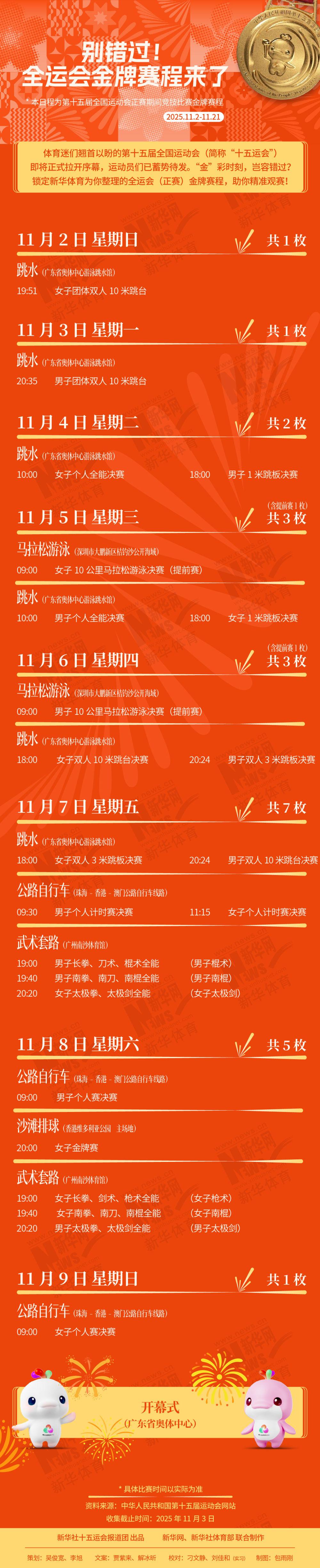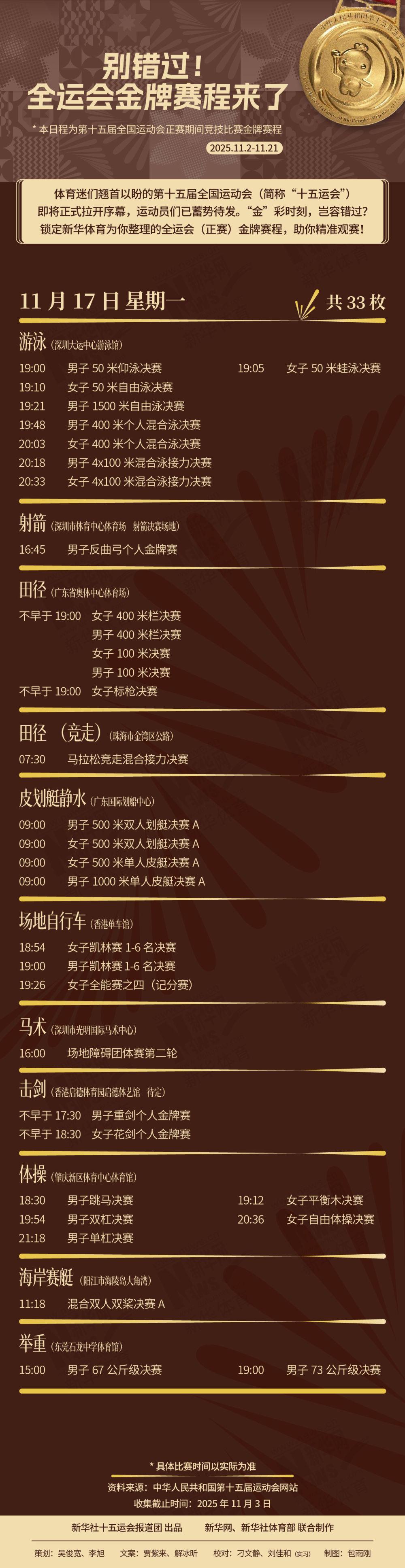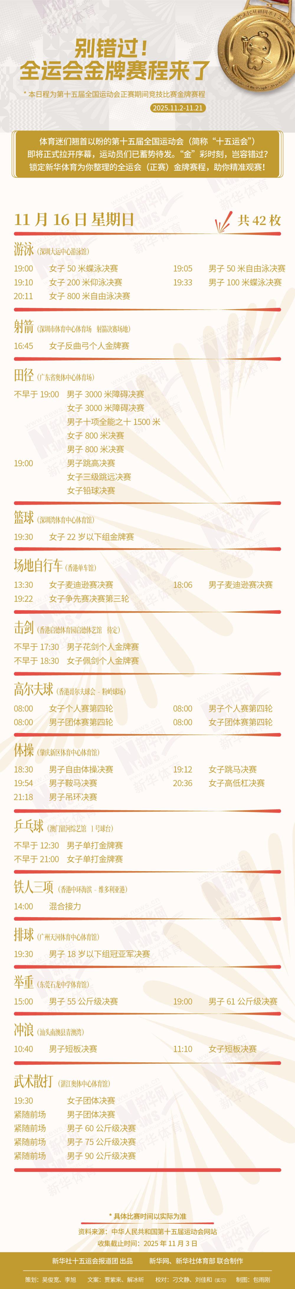 体育迷们翘首以盼的第十五届全国运动会(简称“十五运会”)即将正式拉开序幕,运动员们已蓄势待发。“金”彩时刻,岂容错过?锁定新华体育为你整理的全运会(正赛)金牌赛程,助你精准观赛!