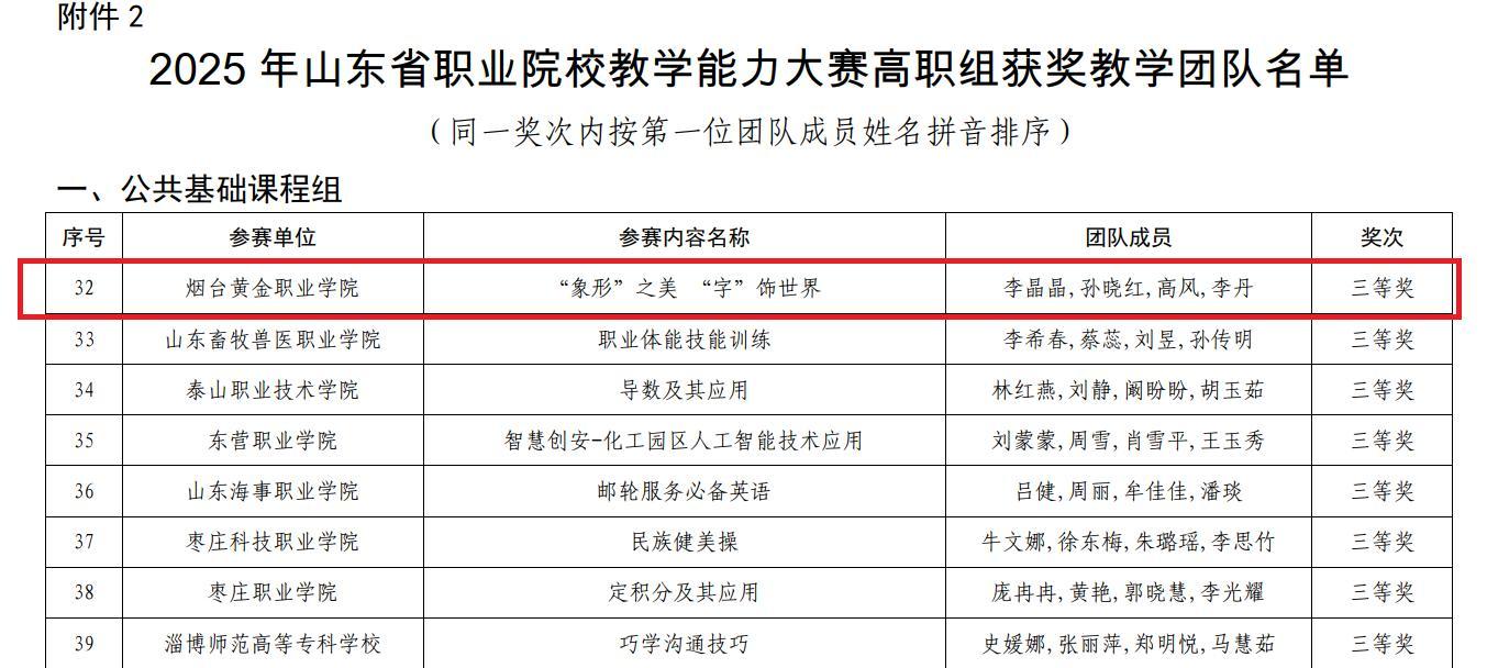 水母网11月6日讯(通讯员 帅涛)近日,省教育厅公布2025年山东省职业院校教学能力大赛获奖名单。烟台黄金职业学院文化教育系由李晶晶、孙晓红、高风、李丹组成的教学团队凭借作品《“象形”之美“字”饰世界》获公共基础课程组三等奖。