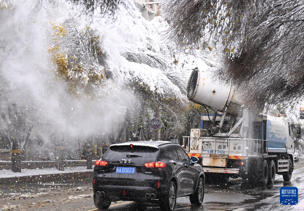 11月6日,在乌鲁木齐市红山路,环卫部门工作人员利用机械吹落树顶积雪,以防积雪压断树枝,排除安全隐患。