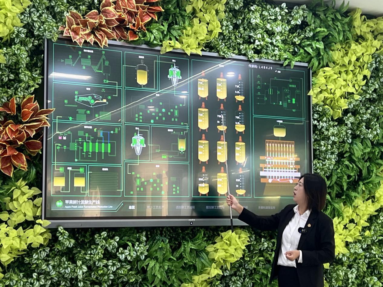 在大数据平台前,贾冰操作屏幕向采访团演示和讲解:“这是我们在龙口生产基地搭建的高端数字化信息平台,能实时查看果醋发酵前端全流程。大家看,从烟台苹果进场后的榨汁前处理、带榨压榨、酶解超滤,到加酵母菌发酵成酒、离心后加醋酸菌发酵成醋,再到超滤、360天陈酿,所有环节都在龙口车间完成,还原糖、酒精度、醋精度等关键数据实时监控,严格遵循‘两度糖转一度酒,一度酒转一度醋’的工艺配比,产品准确率达100%。”她补充,绿杰在龙口的生产基地建立了18道在线监测体系,从原材料进场到产品出厂,每个细节都不放过,还通过FSSC 22000、BRCGS、HACCP三大国际质量管理体系认证,用实际行动践行“安全为天,品质创牌”的承诺。