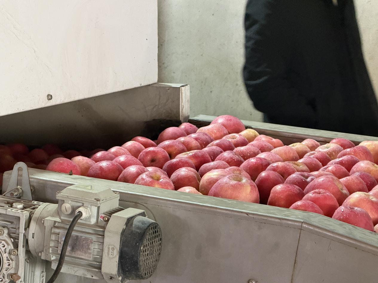 随后,采访团走进苹果选果车间现场。车间内,刚从基地运来的烟台苹果色泽红润,在智能分拣线上有序移动——光学检测设备实时读取苹果的大小、甜度、果面光洁度数据,工人根据数据将苹果分入不同料箱。“大家现在看到的分选线,决定了每一颗苹果的‘命运’。”王朋山在机器轰鸣声中向采访团解释道:“高端果直供商超,深加工原料果就进入深加工线,用来制作苹果罐头、果泥产品以及系列果汁,真正做到物尽其用。”他特别强调,“我们的品控其实从种植就开始了。”王朋山指着分选线说,“如果源头标准不一,再好的分选设备也分不出这么高的优果率。”而这源头把控的关键,正在于联蕾独创并严格推行的“公司+基地+农户”及“六统一”管理模式:统一标准、管理、浇水、施肥、摘袋、收购。通过这套体系,联蕾将“种植端”的严苛要求贯彻到底:从土壤改良的有机肥标准,到疏花疏果的挂果数量,再到采摘前的糖度检测,皆有章可循。这套从种植起就介入的全程品控体系,为苹果的卓越品质奠定了坚实基础。