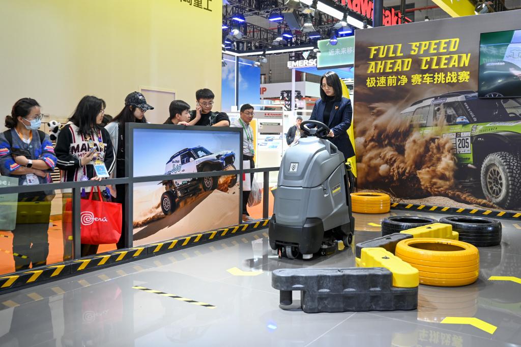 观众在体验卡赫站立式洗地机,直观感受产品的性能和操控体验。澎湃新闻记者 朱伟辉 图