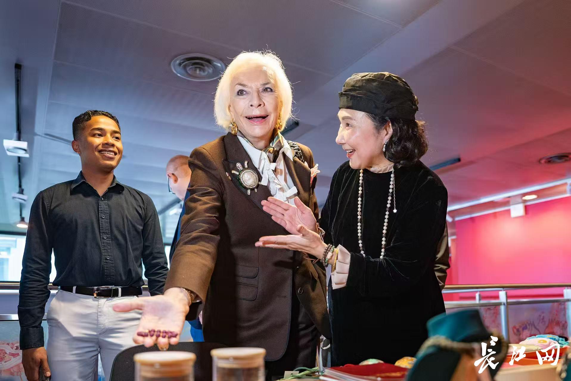 活动现场,法国嘉宾与楚香非遗传承人韩雪交流,感受湖北楚香文化。彭泉锦 摄