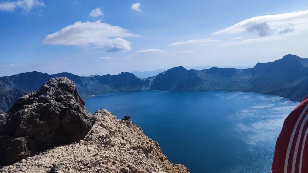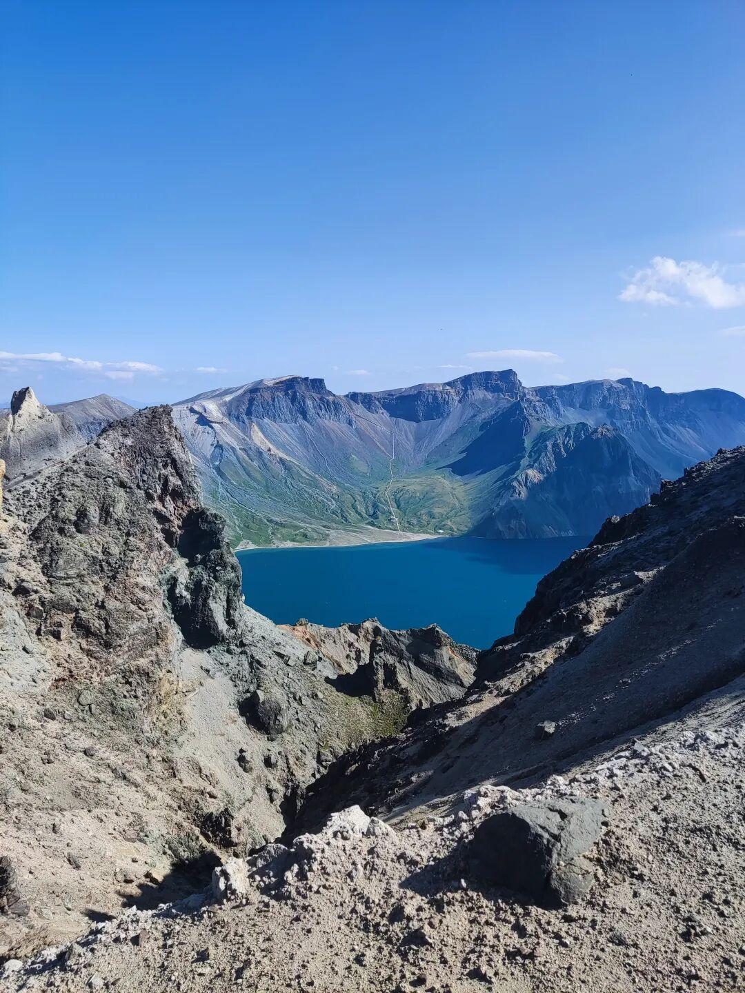 车停于天池观景平台,只见所有人都震撼无言。天池——这位神秘的女神,终于显露真容。湖面如镜,光滑如缎,清晰地映照着蓝天、流云与四周的巍巍青山。几座小岛点缀其间,如墨玉盘上散落的珍珠。我们静立,只闻风声猎猎。二姐举起相机又放下,轻声道:“这样的美,是带不走的。”最终无人拍照,只愿以眼入心,将这片绝世的蓝色深深烙印。